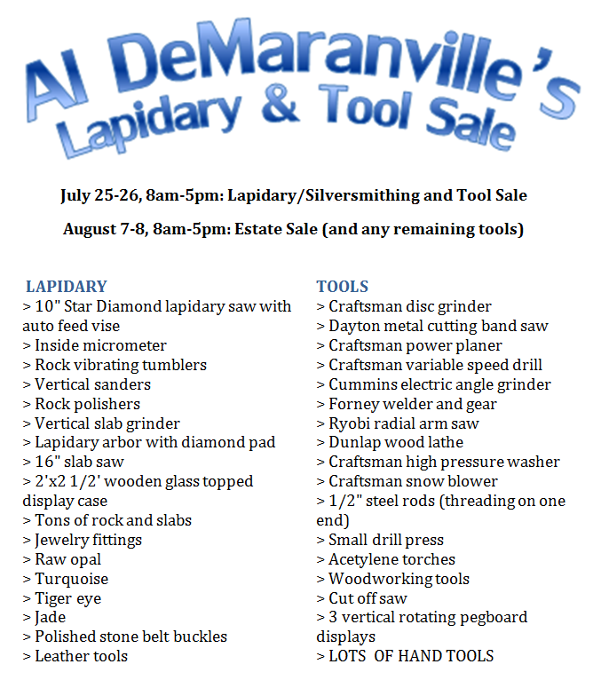 “Big Al” DeMaranville is having a rock and tool sale in Kansas City, Kansas so that he can move into a new home. On the first weekend, July 25-26 (8am-5pm), there will be rocks and lapidary/silversmithing equipment for sale. The second weekend, August 7-8 (8am-5pm), will have a house sale (and any tools that haven’t been sold yet).