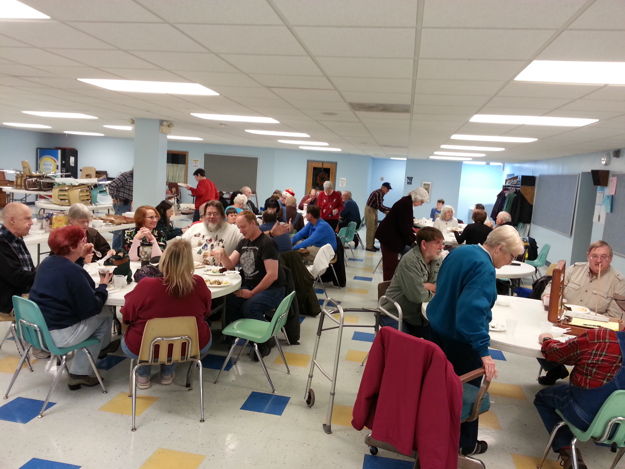 It wasn’t really a “meeting” when we gathered at the Westport Flea Market on December 15th, but it was a darn good party. About 20 of us took over tables and chairs in the area by the pinball machines, but this year no one was playing the machines, so all the noise was ours. After socializing and food, we got down to serious gift opening (and theft). Steve and Charline Dumortier, making it clear who exactly has foresight in this group, brought a big trash bag in which to put discarded wrapping and ribbon.