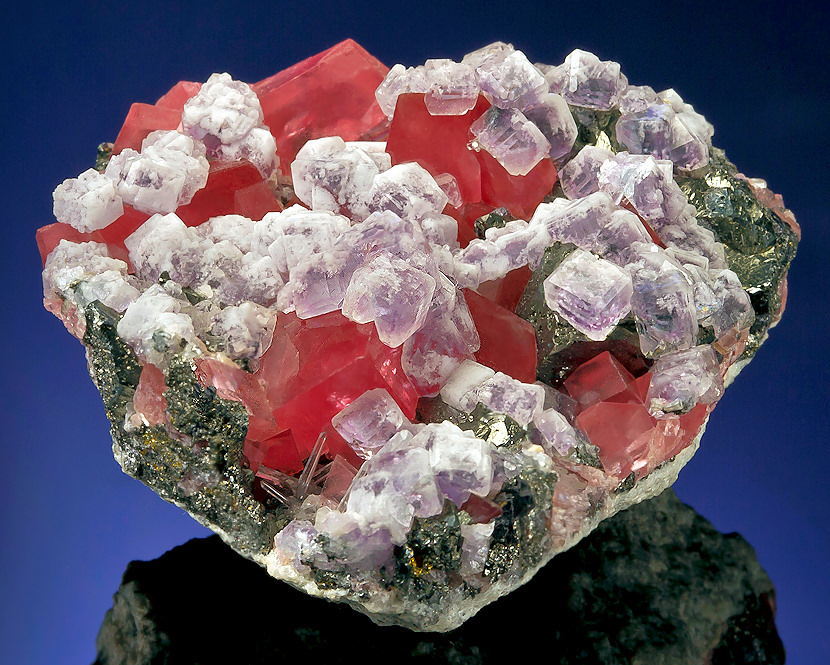 This gorgeous crystal specimen is perfect for Christmas! It has red rhodochrosite crystals on a green matrix (green pyrite?), with pale lavender fluorite cyrstals that look like little snowdrifts. From Steve’s Pocket, Fluorite Raise, Sweet Home Mine, Alma, Colorado.